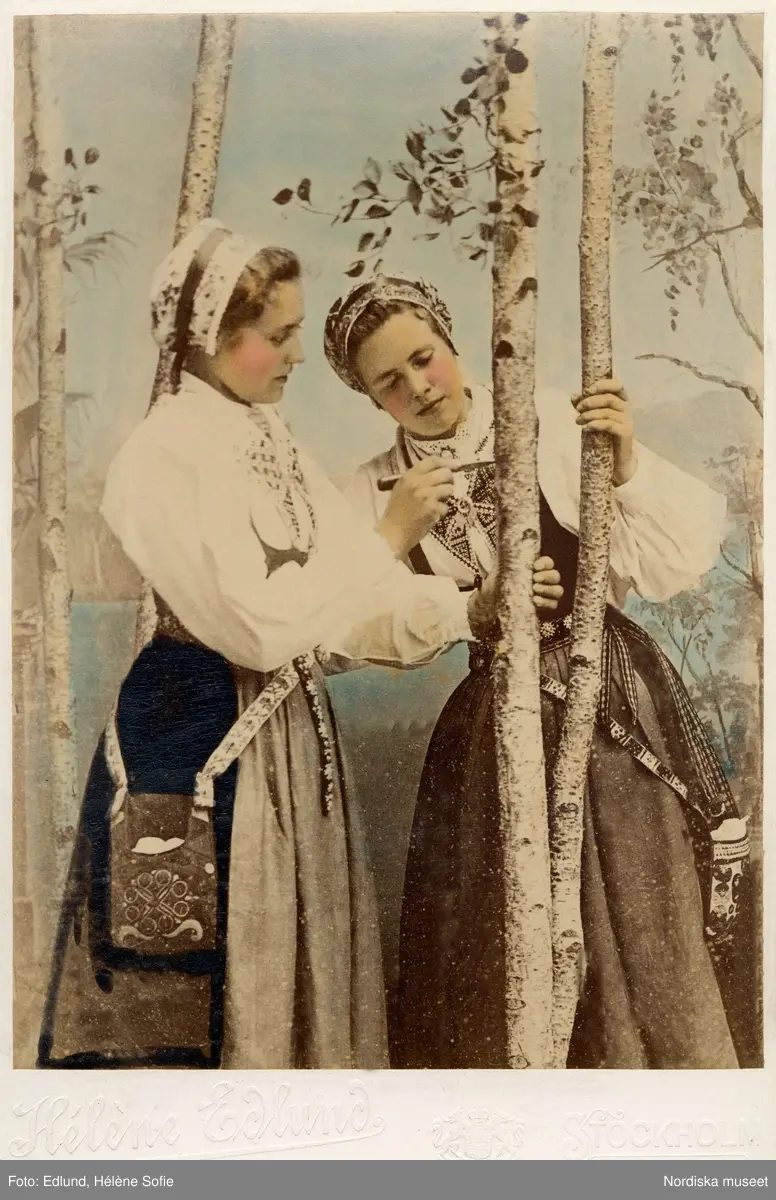 Två unga kvinnor i folkdräkter står och ristar i ett träd