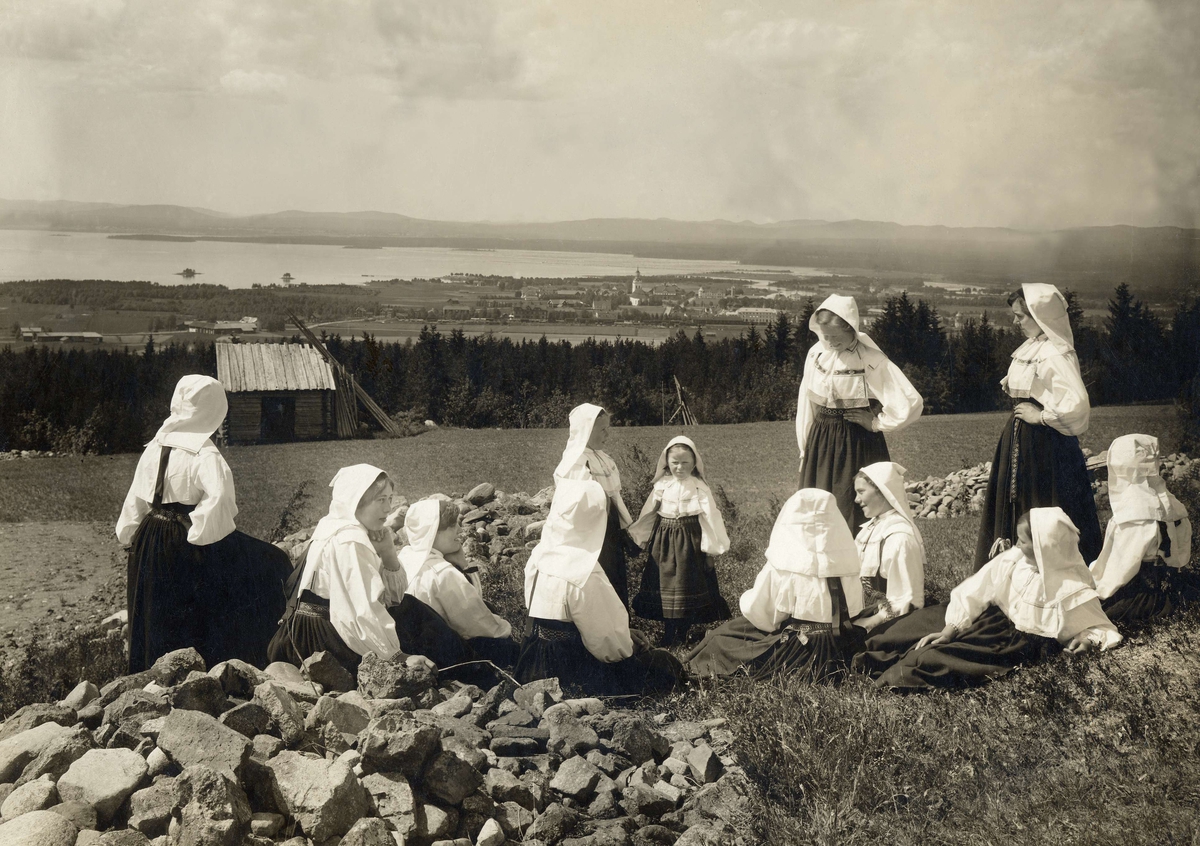Utsikt över Orsa kyrkby och Orsasjön, Dalarna. Kvinnor och barn i orsadräkt.