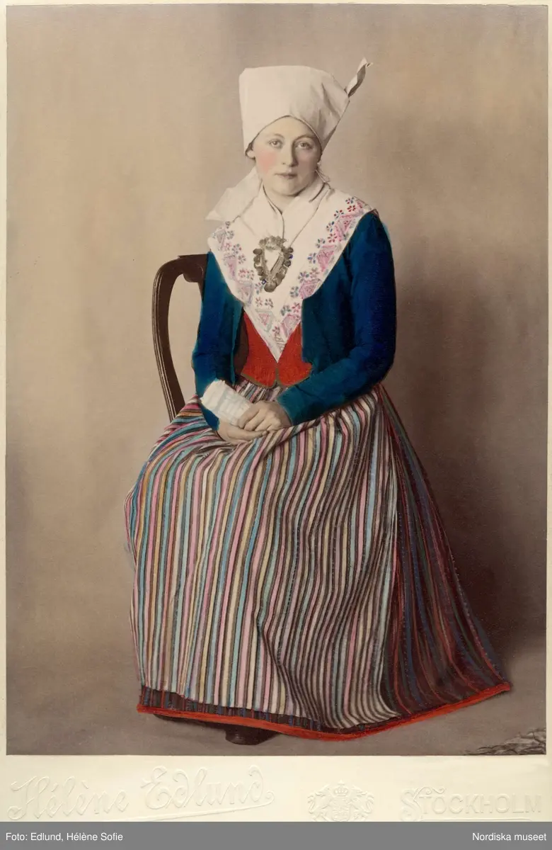 Titel: Handkolorerat porträttfotografi av kvinna iklädd folkdräkt; kyrk- och högtidsdräkt för gift kvinna från Skedvi socken och Finspångs härad.