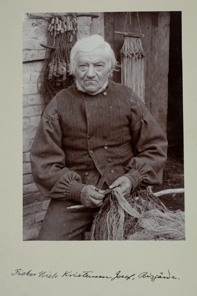 Porträtt av fiskare som sitter med nät och redskap i händerna. Ark med monterat foto och text: "Fisker Niels Kristensen Josef, Risgårde."