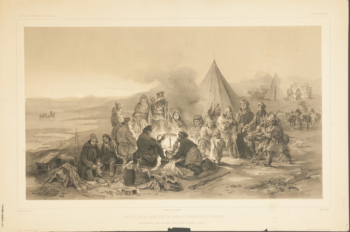 Grafiskt tryck. Teckning av Ch. Girand. "Halte de la commission du Nord, a Lupsäkoppi, en Finmark. Le 8 Septembre 1839, au milieu d'une famille de lapons errants." Människor samlade kring en eldstad, lägerplats.