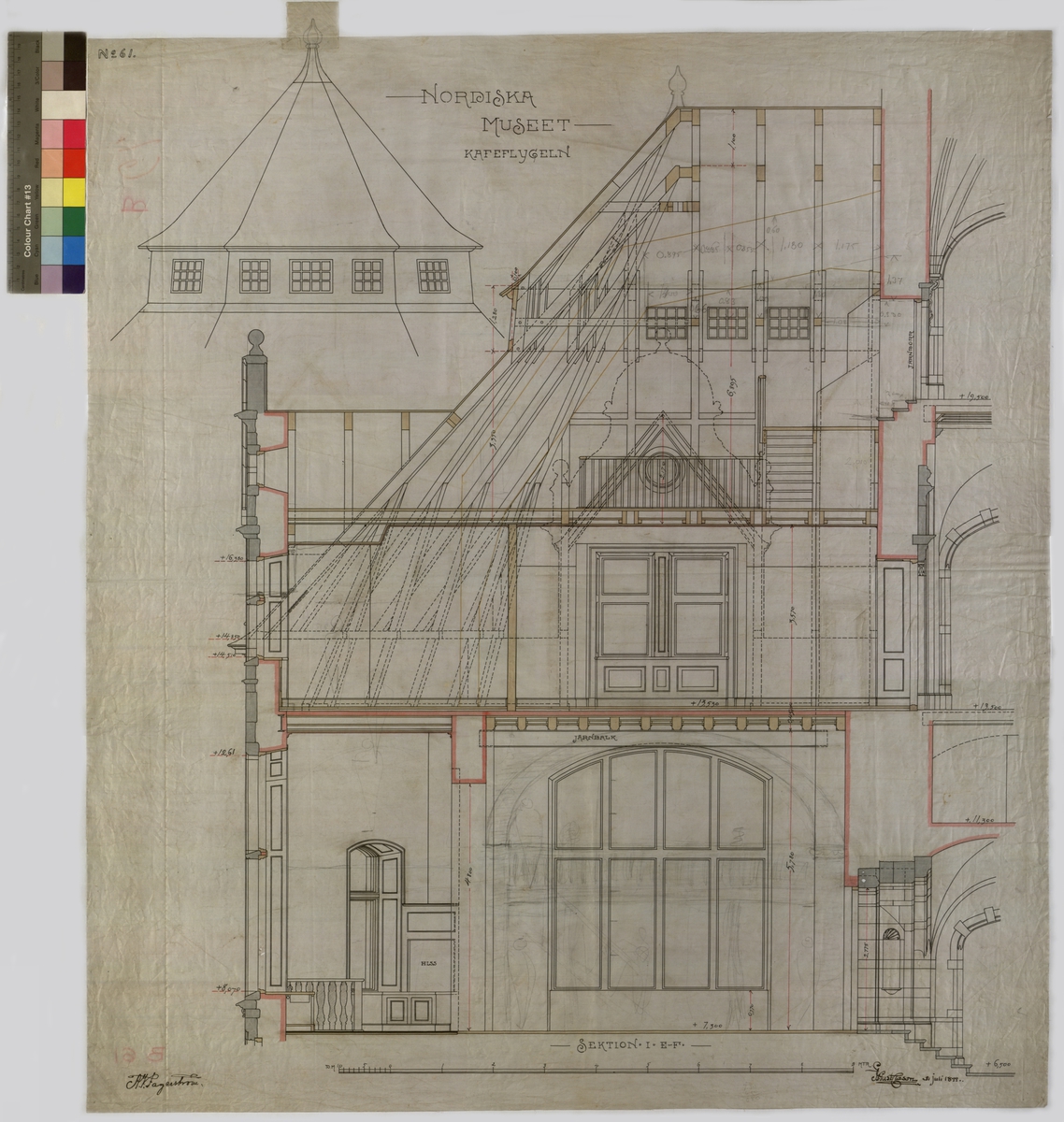 Ritning på väv över Nordiska museets huvudbyggnad. Kafeflygeln. Sektion. Kafébygnaden. Tusch, rött, blyerts, gult, och grått. Linjalritning. I Gust Clason 31 Juli 1899. A V Fagerström.