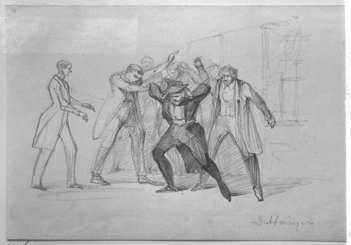 Gesällinvigning på Timmermansordens Eriksberg i början av 1840-talet. Huru man blef muraregesäll på 40-talet. Dubbningen, gesällen iklädd en grov hatt pucklas på av kamraterna.