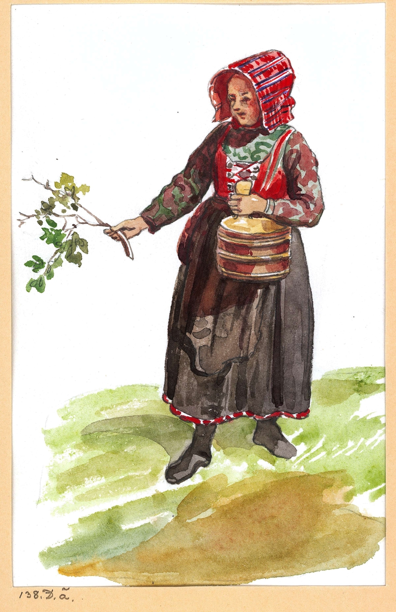 Folkdräkt, kvinna. Floda socken, Dalarna. Akvarell. Kopia efter J.W. Wallander.