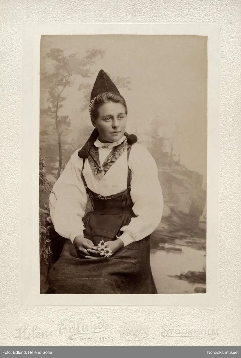 Ung kvinna poserar i en folkdräkt från Rättvik i Dalarna.