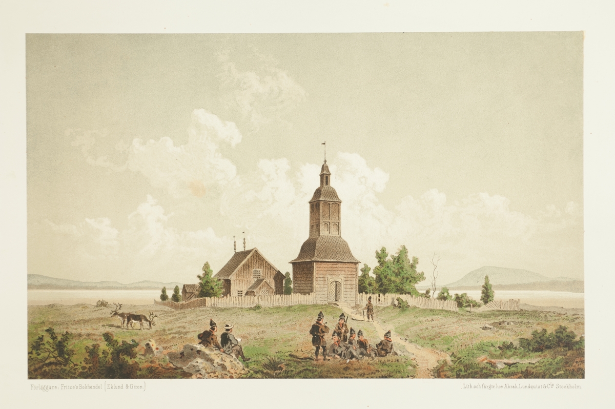 Färgtryck. Vy över fjällandskap med kyrka, Människor sitter på marken utanför kyrkan, renar betar intill. Motivet "Jukkasjärvi kyrka" är hämtat ur Carl Anton Petterssons planschverk Lappland, dess natur och folk från 1866.