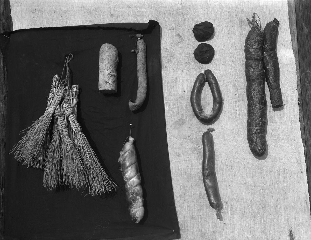Titel: Svensk allmogekost. Köttets användning. Olika slags korv. Tullkorv, fläskkorv, köttkorvar av nötkreatur, pölsa av nötkreatur, isterrulle.