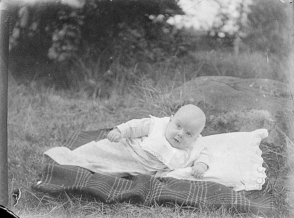 Ett spädbarn ligger på en filt i det gröna. Lima, Dalarna
