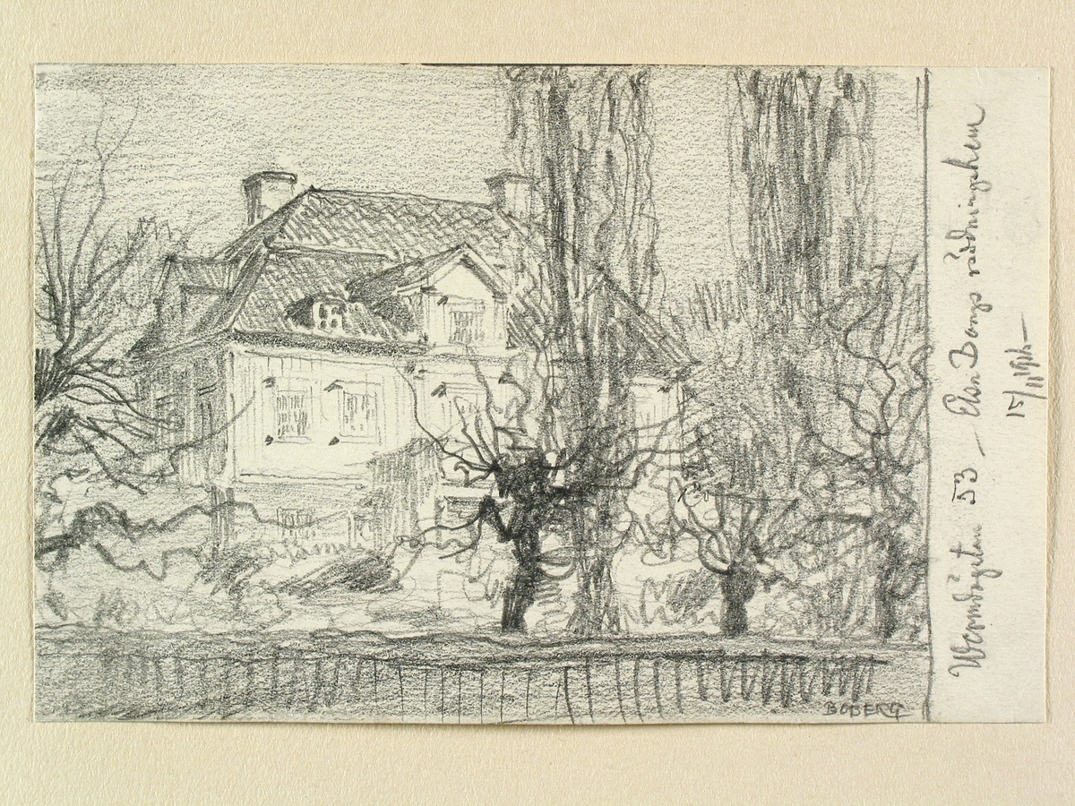 Stockholm, Södermalm, Kv. Vintertullen mindre, Värmdögat. 53 (nuvarande Malmgårdsvägen). Elsa Borgs räddningshem (skyddshem för flickor) i Groens malmgård. Teckning av Ferdinand Boberg.