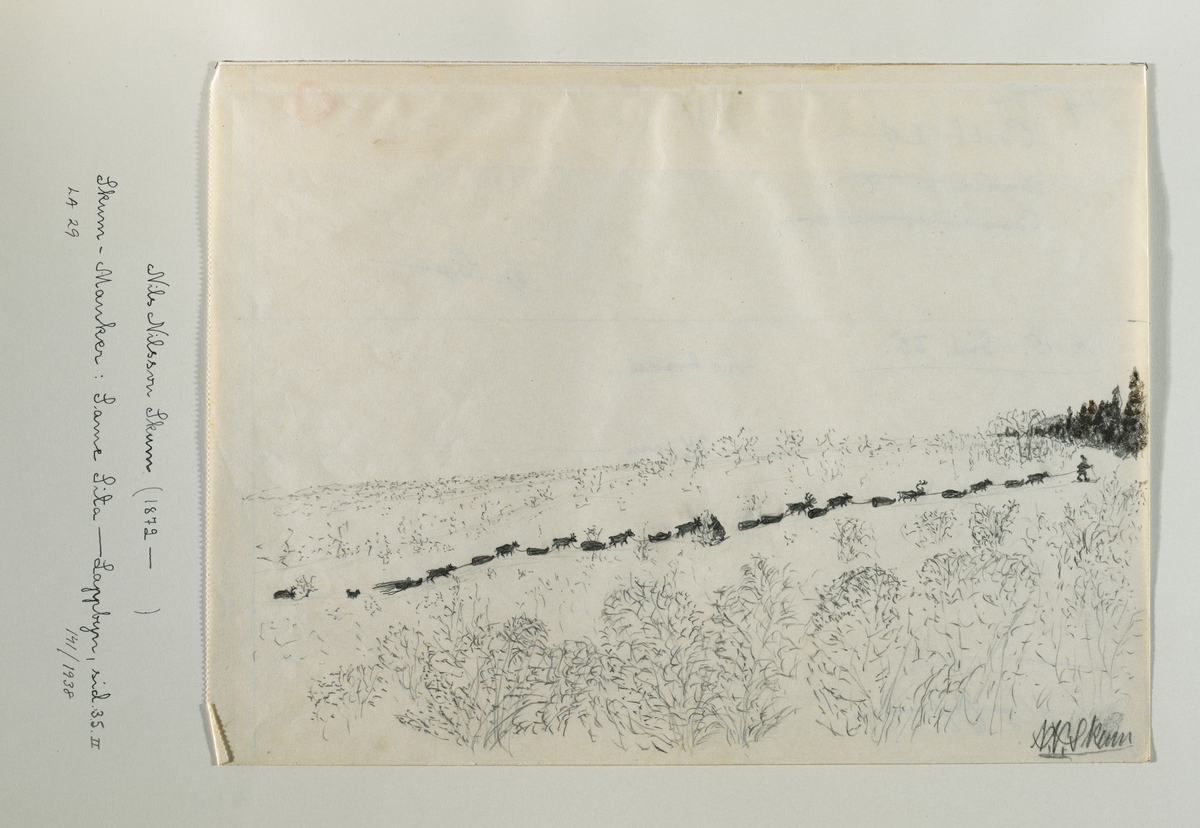 Teckning av Nils Nilsson Skum, troligen utförd mellan 1930 och 1938. Samer och renar som drar ackjor. Vårvinter.