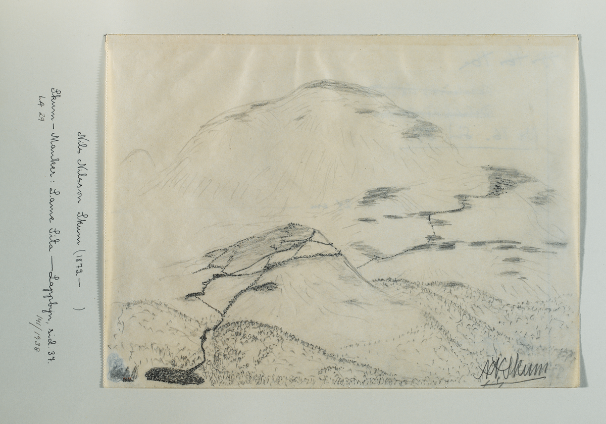 Teckning av Nils Nilsson Skum, troligen utförd mellan 1930 och 1938. Renar på vandring i fjäll. Vår.