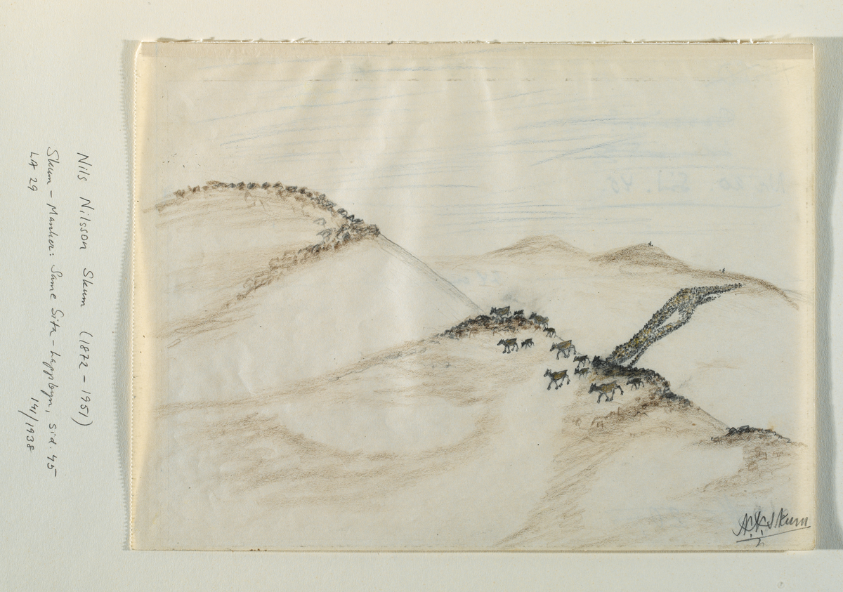Teckning av Nils Nilsson Skum, troligen utförd mellan 1930 och 1938. Renar på fjäll. Vajor och deras kalvar vaktas i en hjord för sig. Vår.