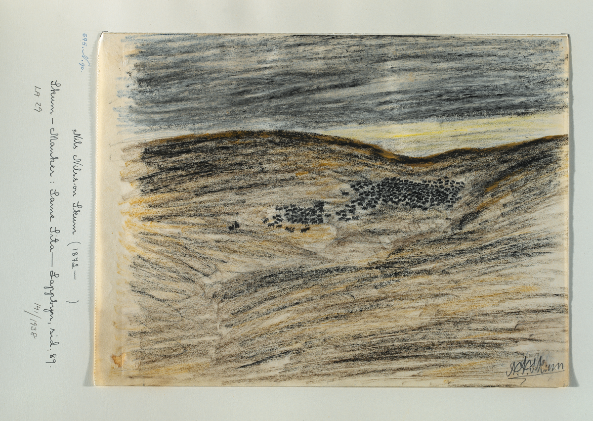 Teckning av Nils Nilsson Skum, troligen utförd mellan 1930 och 1938. Renhjord vilar i frostigt fjällandskap. Höst.