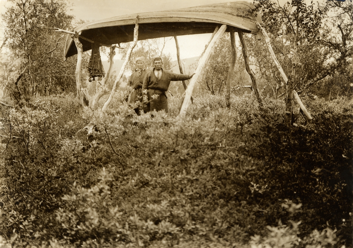 Två män står under en upp och nedvänd båt på en ställning, där hänger också fiskenät. Vid boplatsen i Vaisaluokta.