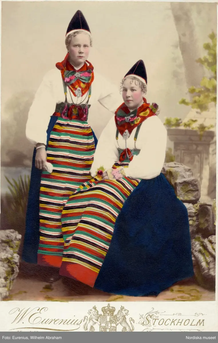 Två unga kvinnor poserar i folkdräkter från Rättvik i Dalarna. den ena kvinnan är möjligen Vass Anna. Kolorerat fotografi.