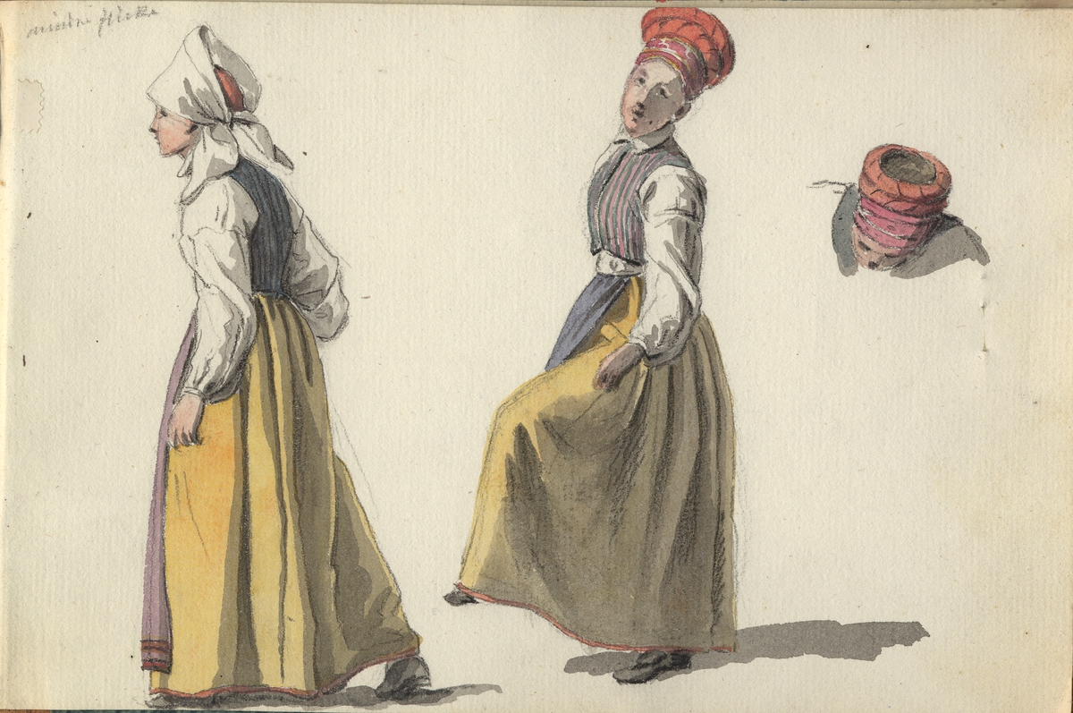 Akvarell. Dräktskiss. Två dansande kvinnor /flickor i folkdräkt i helfigur. Detaljskiss av den enas huvudbonad.Text: "...(?) flicka" Skiss ur skissbok ur Johan Gustaf Sandbergs arkiv, Nordiska museet INV.NR: NM.0080508.
