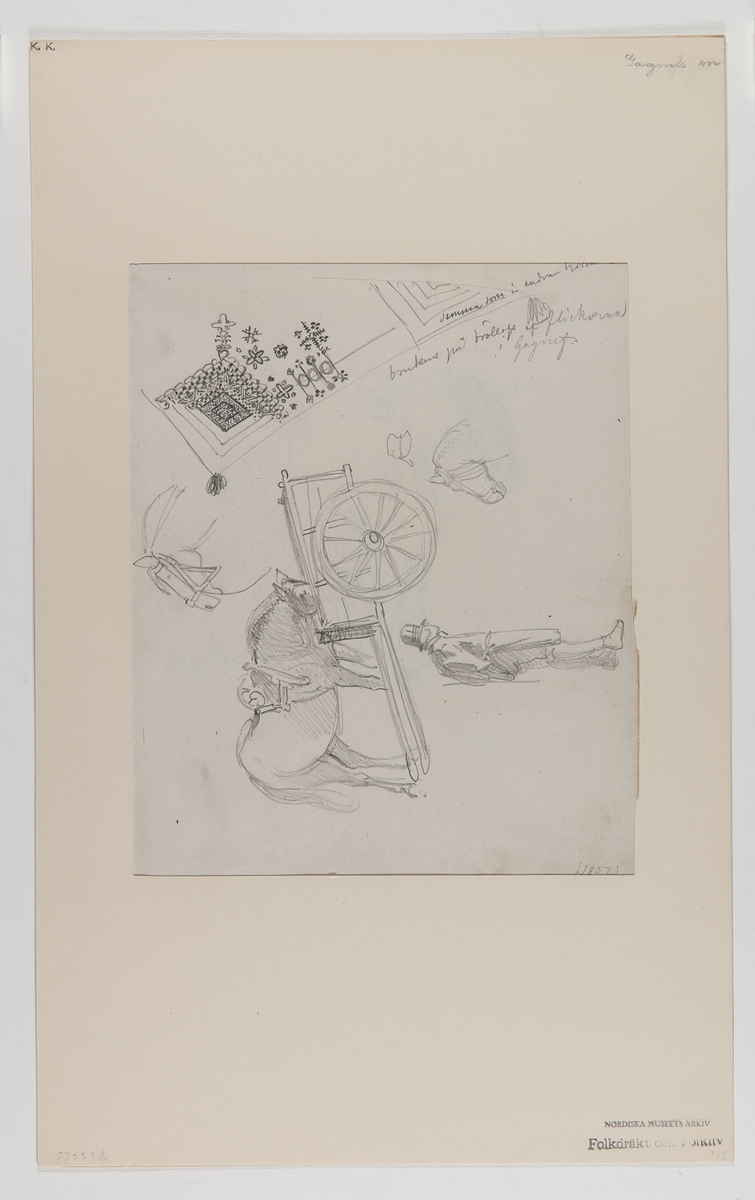 Handteckning av J W Wallander. Mans- och kvinnodräkt från Gagnef, Dalarna. Häst med förspänd vagn.