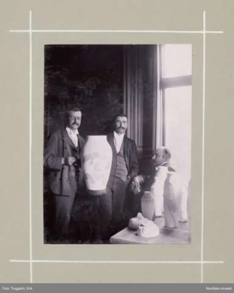 Tre herrar på Rörstrands porslinsfabrik vid sekelskiftet 1900. Porslinsföremål och stor porslinsurna på kavalett.