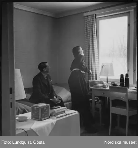 Ett par tittar ut genom fönstret från sitt rum på Abisko turiststation. Vinter ute. I rummet finns säng, skrivbord och ett avlastningsbord med tidningar och en burk kex. På skrivbordet står två termosar. Interiör.