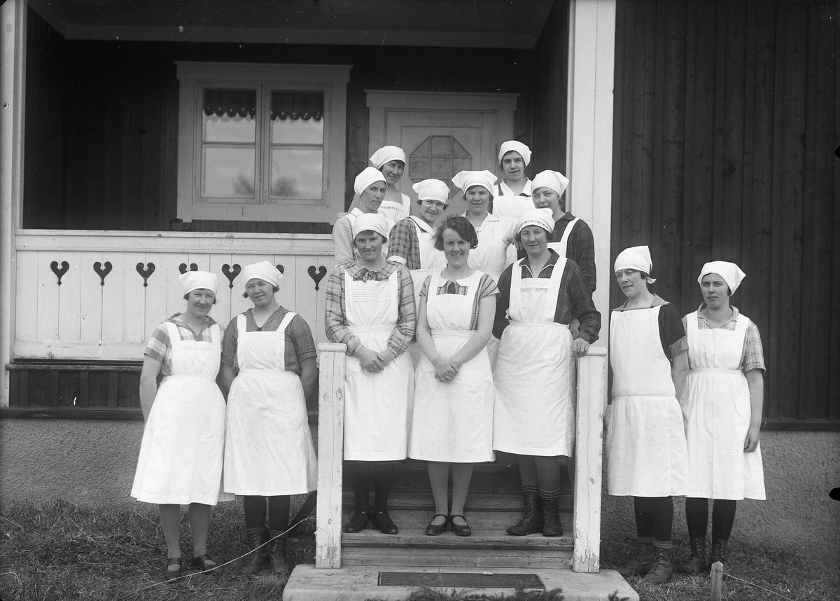 Gruppfoto av kvinnor i uniform i trappan av ett hus.