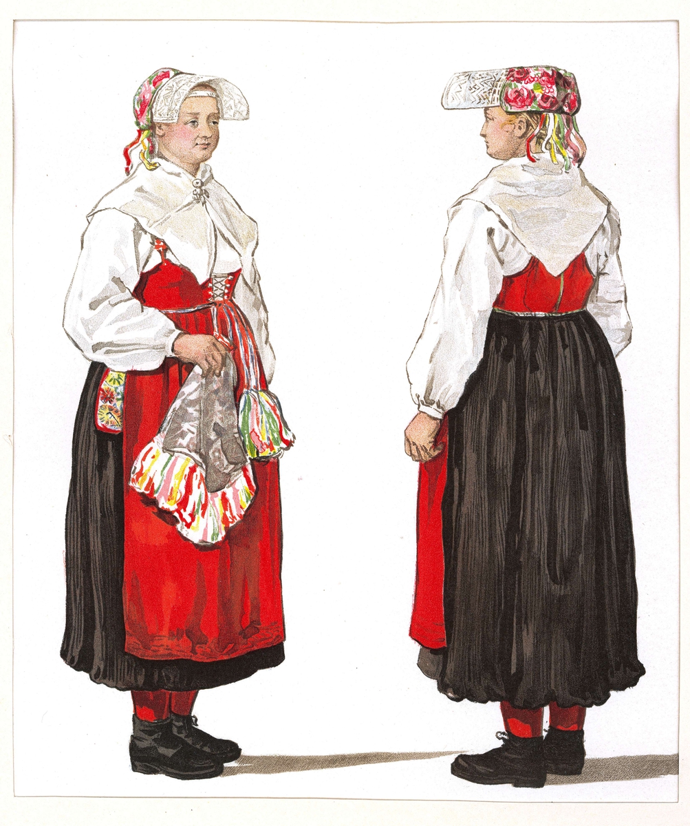 Folkdräkt. Sommardräkt för kvinna. Gagnef socken, Dalarna. Bildtryck efter akvarell av Emelie von Walterstorff. (Sv.Folkdräkter pl. XXII).