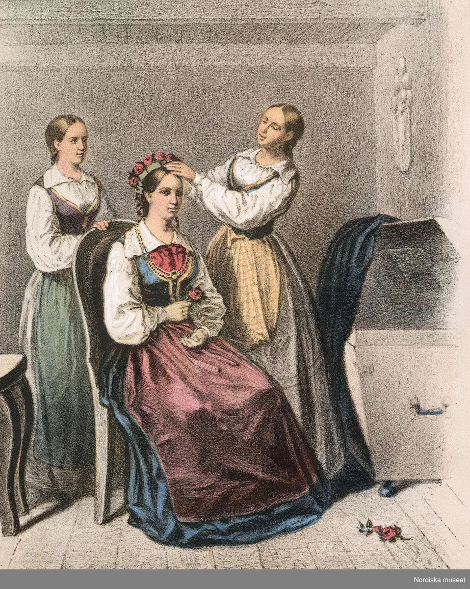 Två kvinnor klär en brud, Blekinge. Bildtryck.