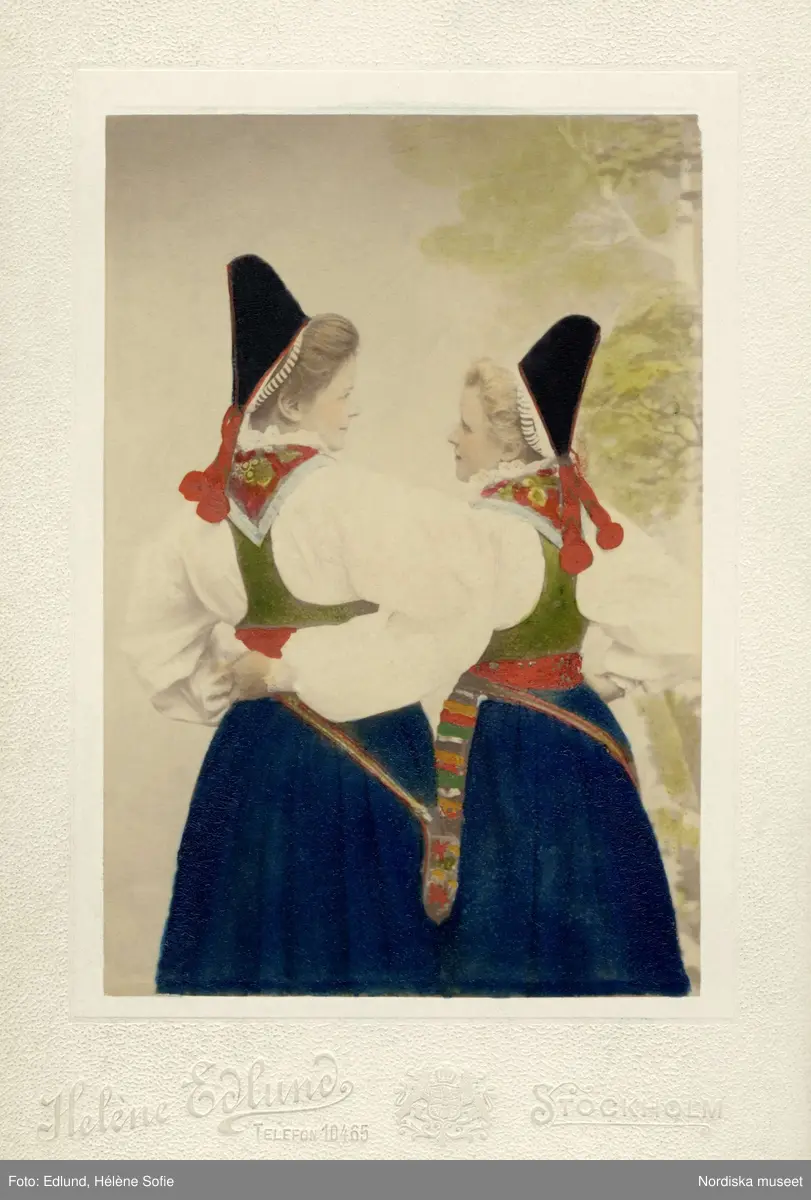 Två kvinnor poserar i folkdräkter, med ryggen vänd mot kameran