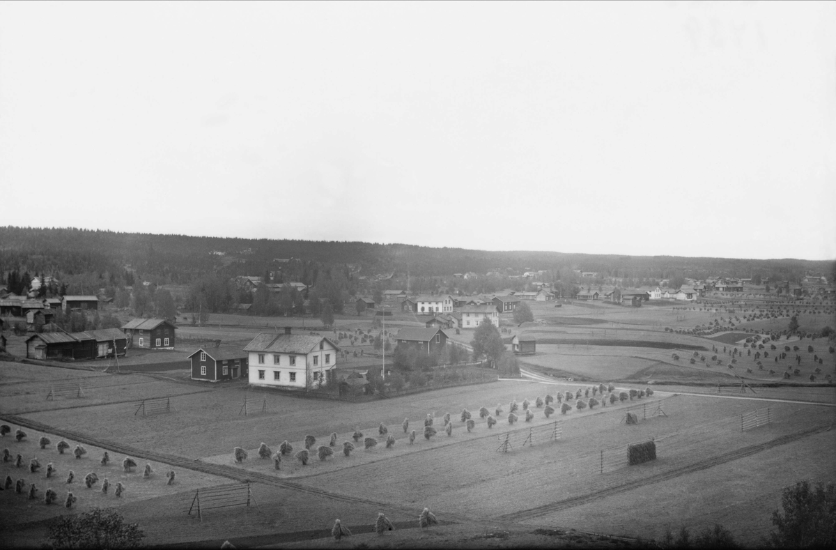 Risätra by. Bilden tagen från utsiktstornet ovanför Risätra folkskola "Snesar" i förgrunden. Renströms, enda handelsboden, postbäraren Springfelts gård