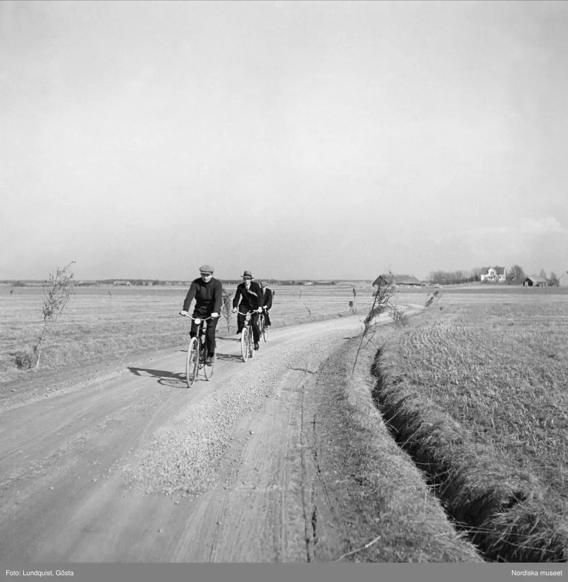 Tre manliga cyklister på grusväg på Dalboslätten i Dalsland.