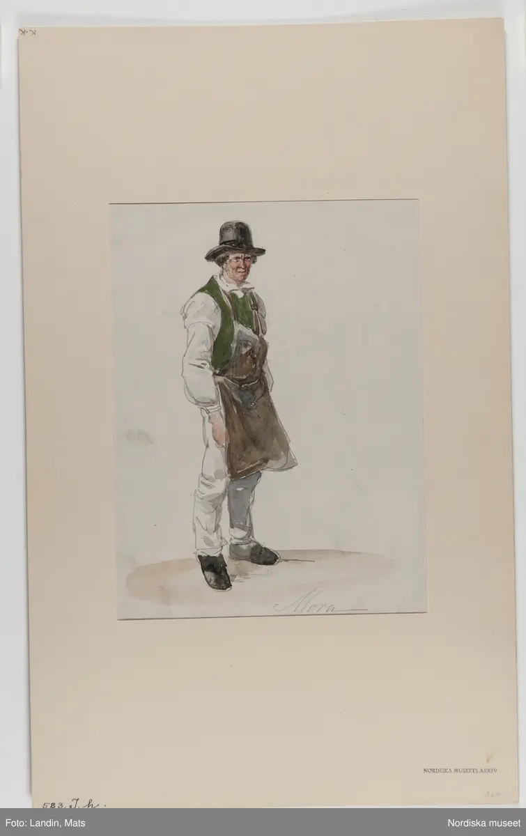 Avarellerad handteckning. Mansdräkt från Mora. Mannen bär rundkullig hatt, skjorta, ett grönt livstyttje (väst) en stjimpa (förskinn) samt ett par långbyxor.