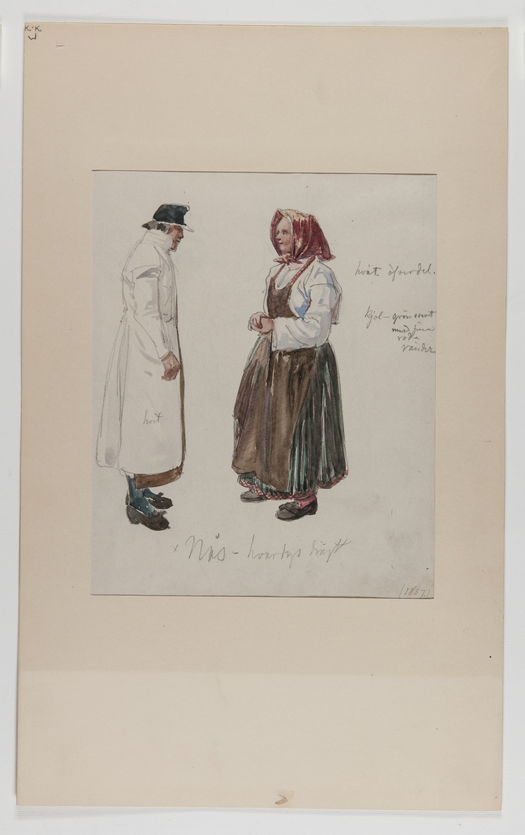 Akvarellerad handteckning av J W Wallander. Mans- och kvinnodräkter från Nås. "Nås - hvardags drägt".