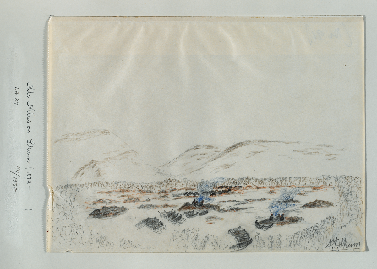 Teckning av Nils Nilsson Skum, troligen utförd mellan 1930 och 1938. Rastplats. Renskötare vid två lägereldar, renar.