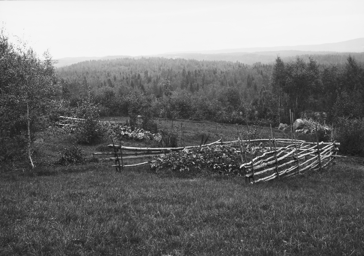 Värmländskt landskap med kålland (kålsäng) inhägnad av gärdesgård.