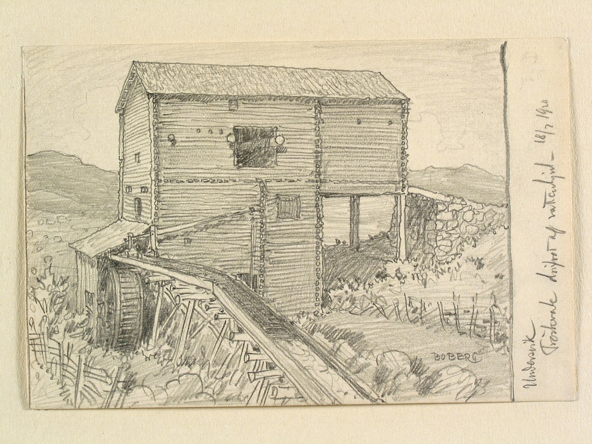 Hälsingland, Undersvik. Tröskverk drivet av vattenhjul. Teckning av Ferdinand Boberg