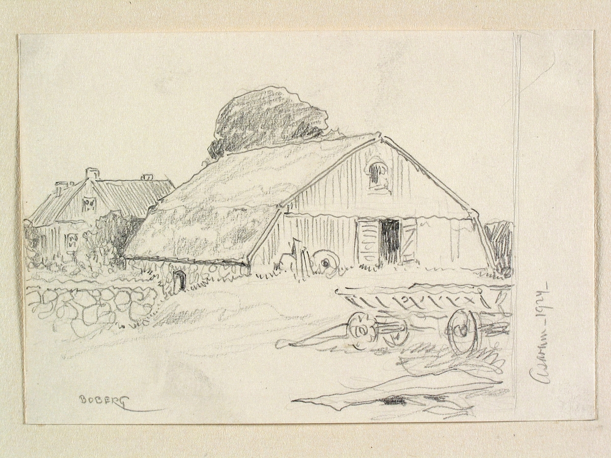 Blekinge, Bräkne hd., Asarums sn. Gårdsbebyggelse. Teckning av Ferdinand Boberg