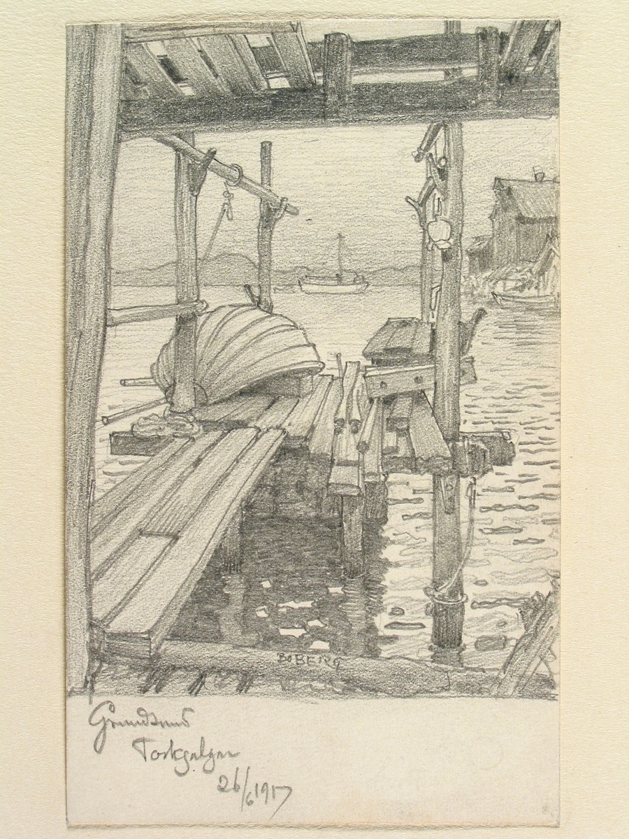 Bohuslän, Grundsund. Brygga med torkgalgar. Teckning av Ferdinand Boberg