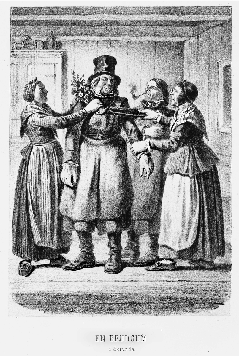 "En brudgum i Sorunda". Efter litografi av C A Dahlström, trol. 1850-tal. Interiör med en brudgum omgiven av två kvinnor och en piprökande man.