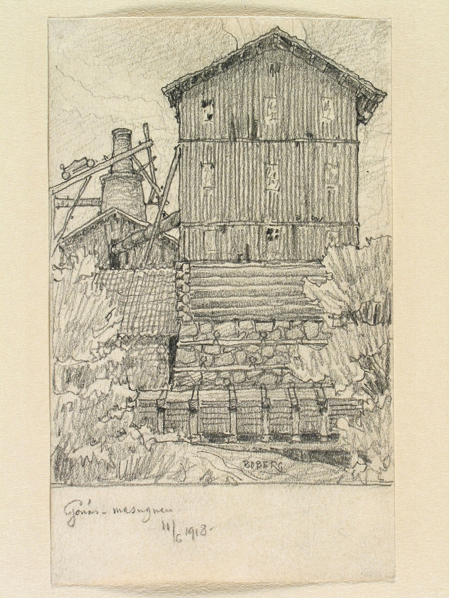 Dalarna, Ludvika sn., Gonäs. Masugnen. Teckning av Ferdinand Boberg
