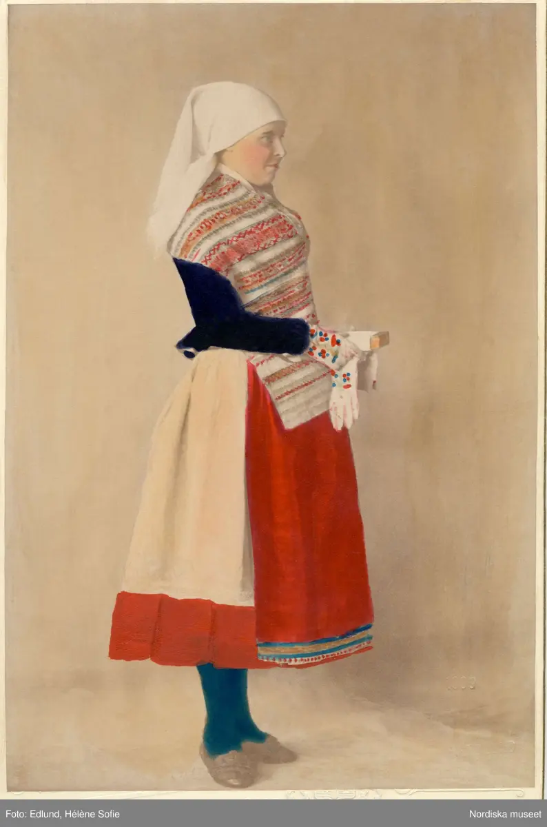 Kvinna klädd i folkdräkt, högtidsdräkt från norra Öland. Handkolorerat fotografi.