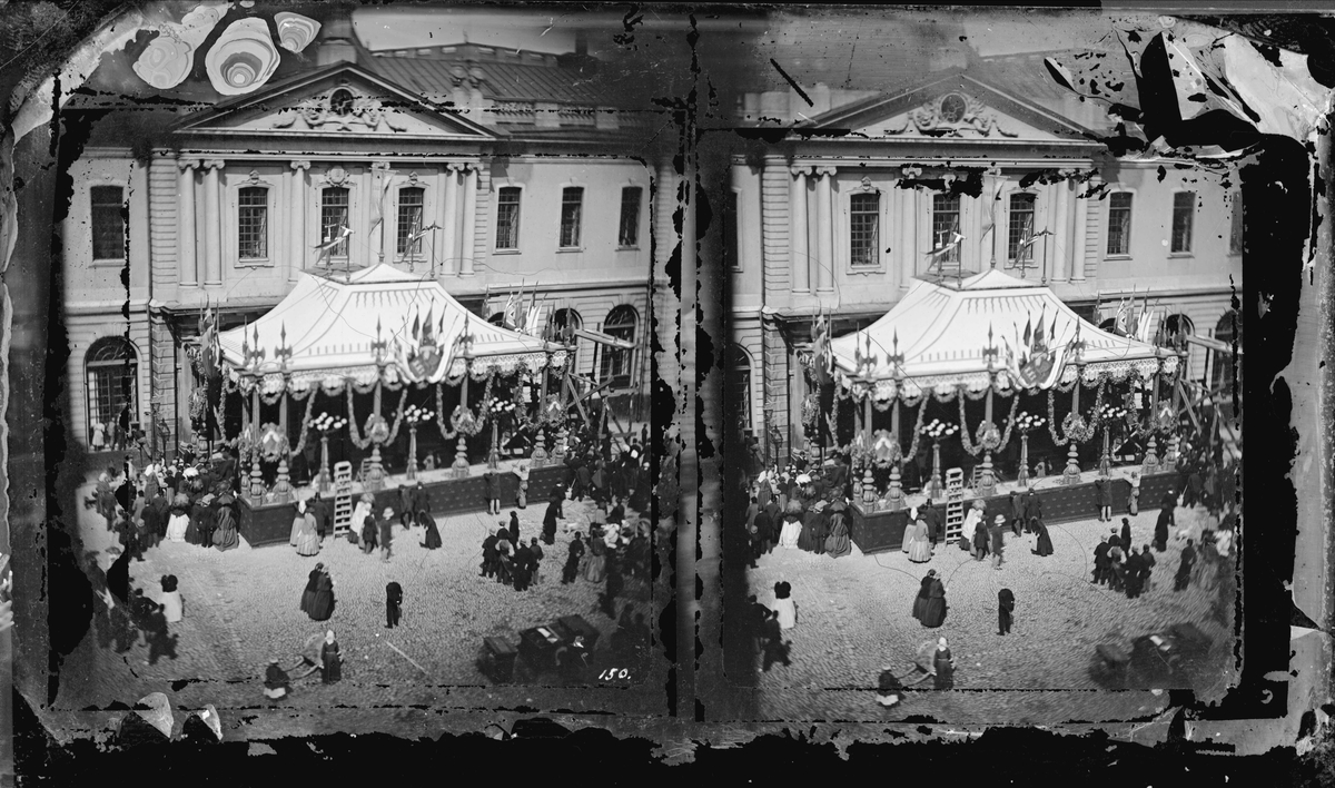 Stockholm, Kv Rådstugan 1, Stortorget 2, Börshuset. Frontalexteriör snett ovanifrån. "Vid något festligt tillfälle. Ant. taget fr. ateliern Stortorget 9." Stereoskopbild.