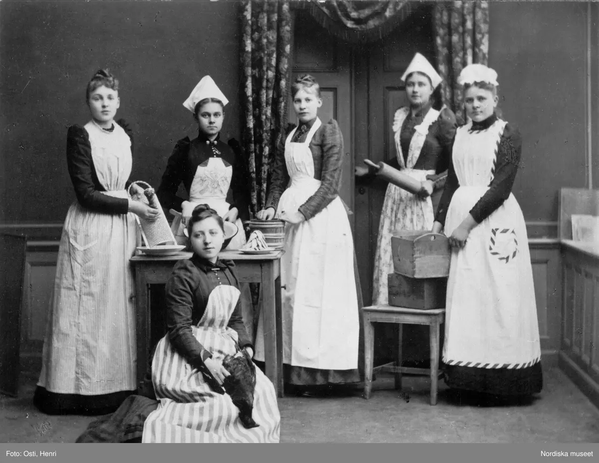 Elever vid Uppsala Hushållsskola. Flickorna är klädda i mörka klänningar och ljusa förkläden, tre stycken har en vit hätta på huvudet. Flickorna håller i olika hushållsredskap. Bakom skymtar en dörr och ett draperi.