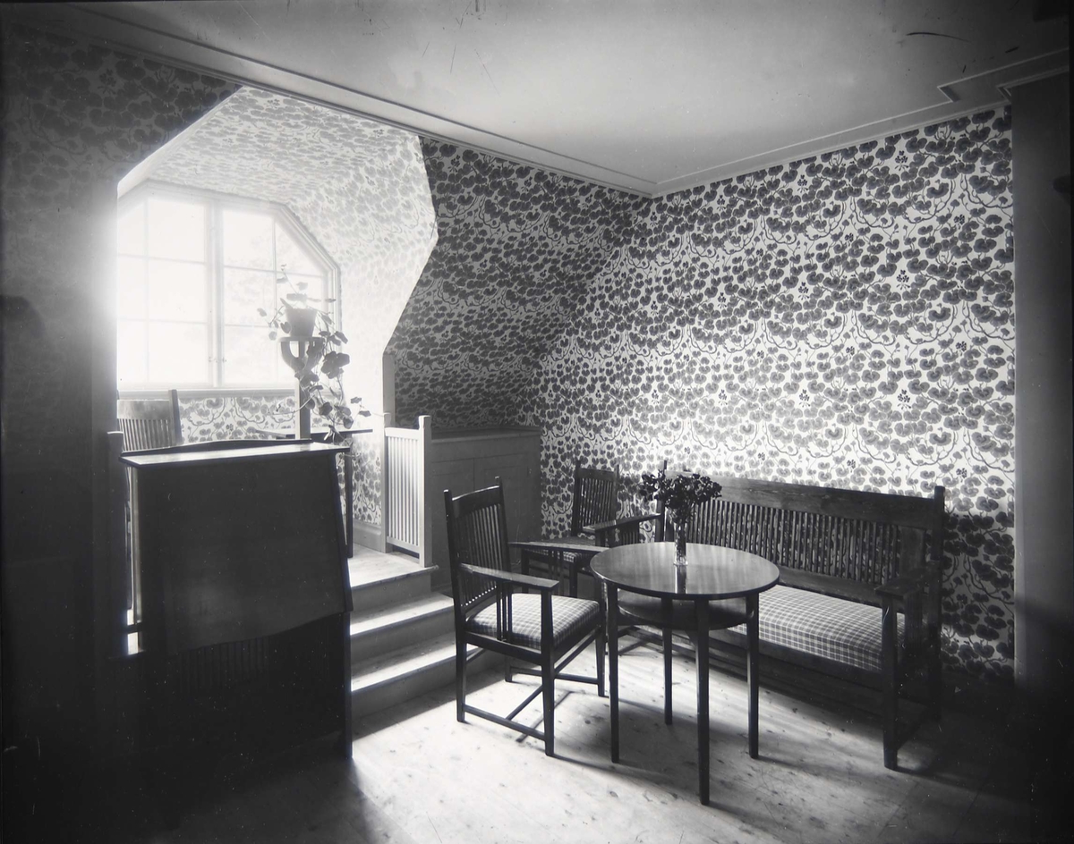 Interiör från Pressens villa, Källvägen 2, Saltsjöbaden, Nacka. Gästrummet. Arkitekt Carl Westman, 1902.