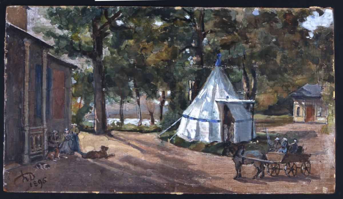 "Gården, tält o vagn. Guldbröllopet". Olja på cigarrlådelock av Fritz von Dardel, 19 juni 1896