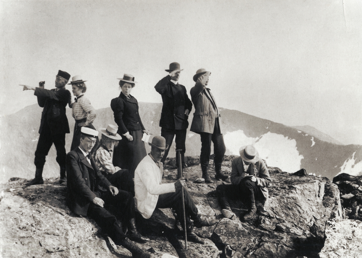 De första turisterna på toppen av Storsylen. Fjällandskap.
