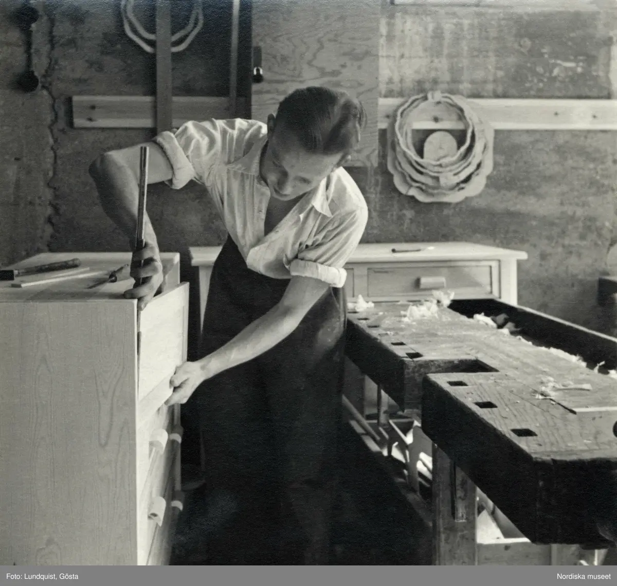 Möbelsnickeri. En ung man arbetar med en byrå.