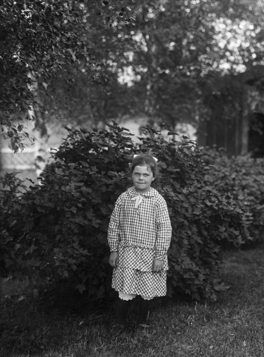 En flicka i rutig klänning i två våder står framför ett buskage. Lima socken, Dalarna.