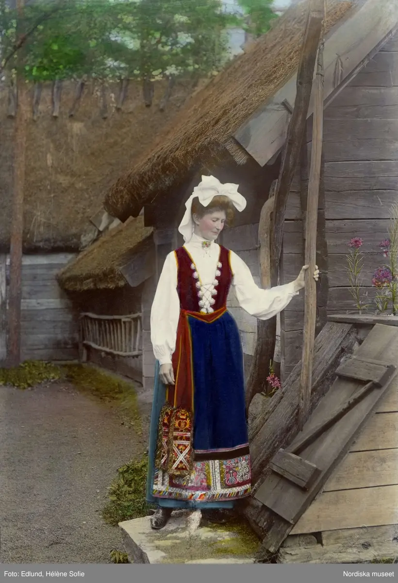 Kvinna i folkdräkt står vid brunn vid ett liggtimrat hus. Klädd i högtidsdräkt från Värend, Småland såsom den tillverkades i rekonstruerad form kring 1900.