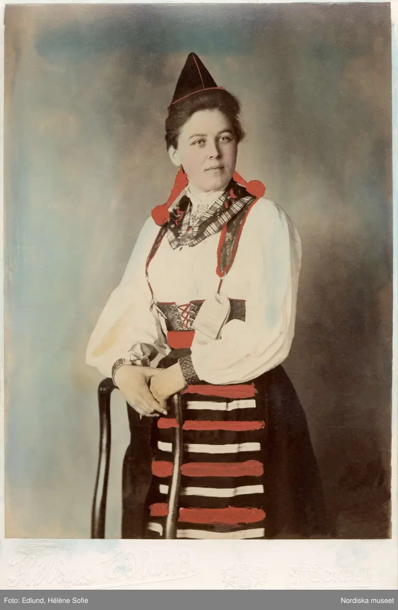 Kvinna poserar i en folkdräkt från Dalarna. Handkolorerat ateljéfoto.