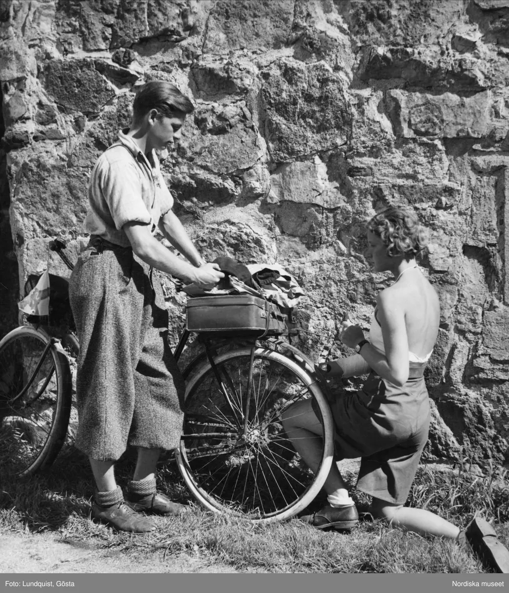 Två cyklister, en ung man och en ung kvinna, har stannat vid en stenmur. han är klädd i vida knäbyxor och skjorta, hon har kortbyxor och ett liv med halterneck.