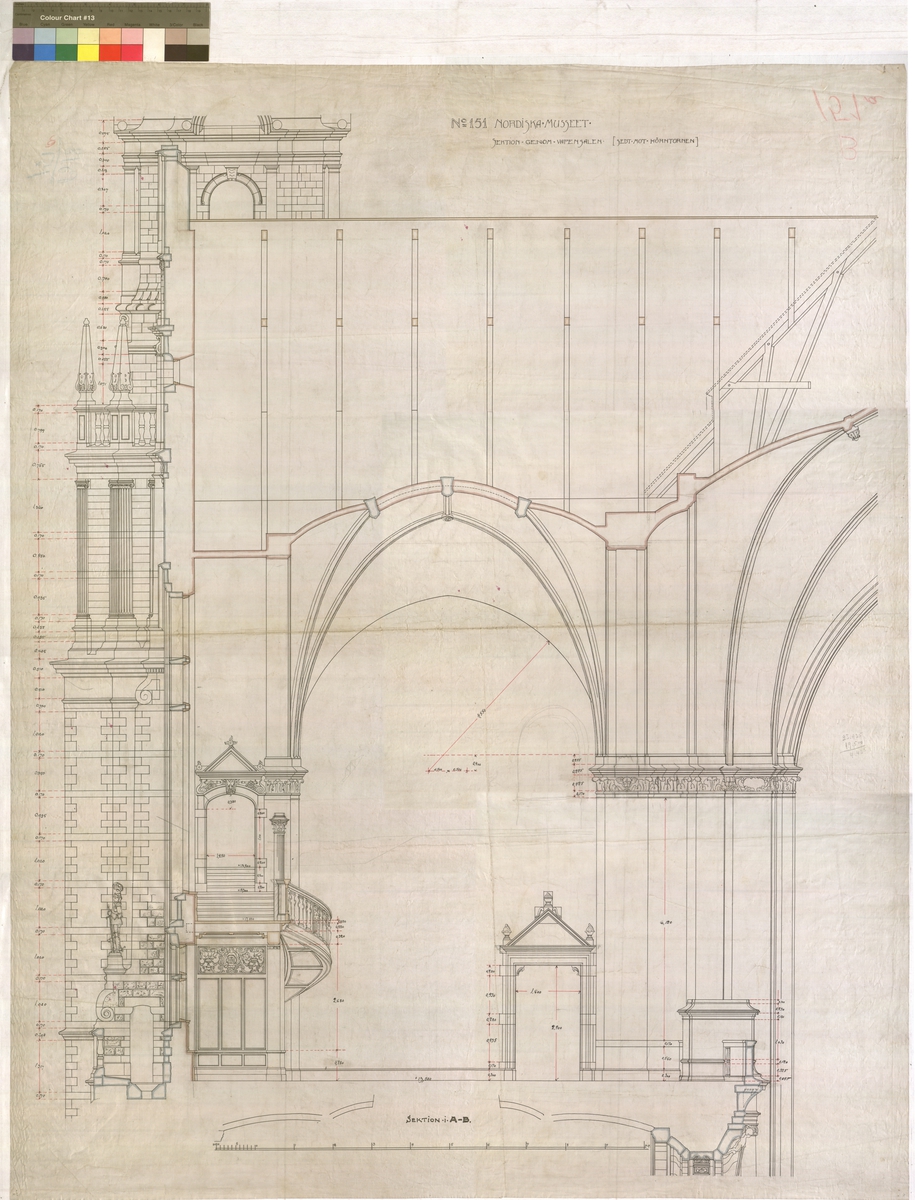 Ritning på väv över Nordiska museets huvudbyggnad. Sektion genom vapensalen [sett mot hörntornen]. Sektion. Kröningsläktaren. 115x92 cm. Tusch, rött, gult, blått och brunt. Linjalritning, fri hand. Osignerad.